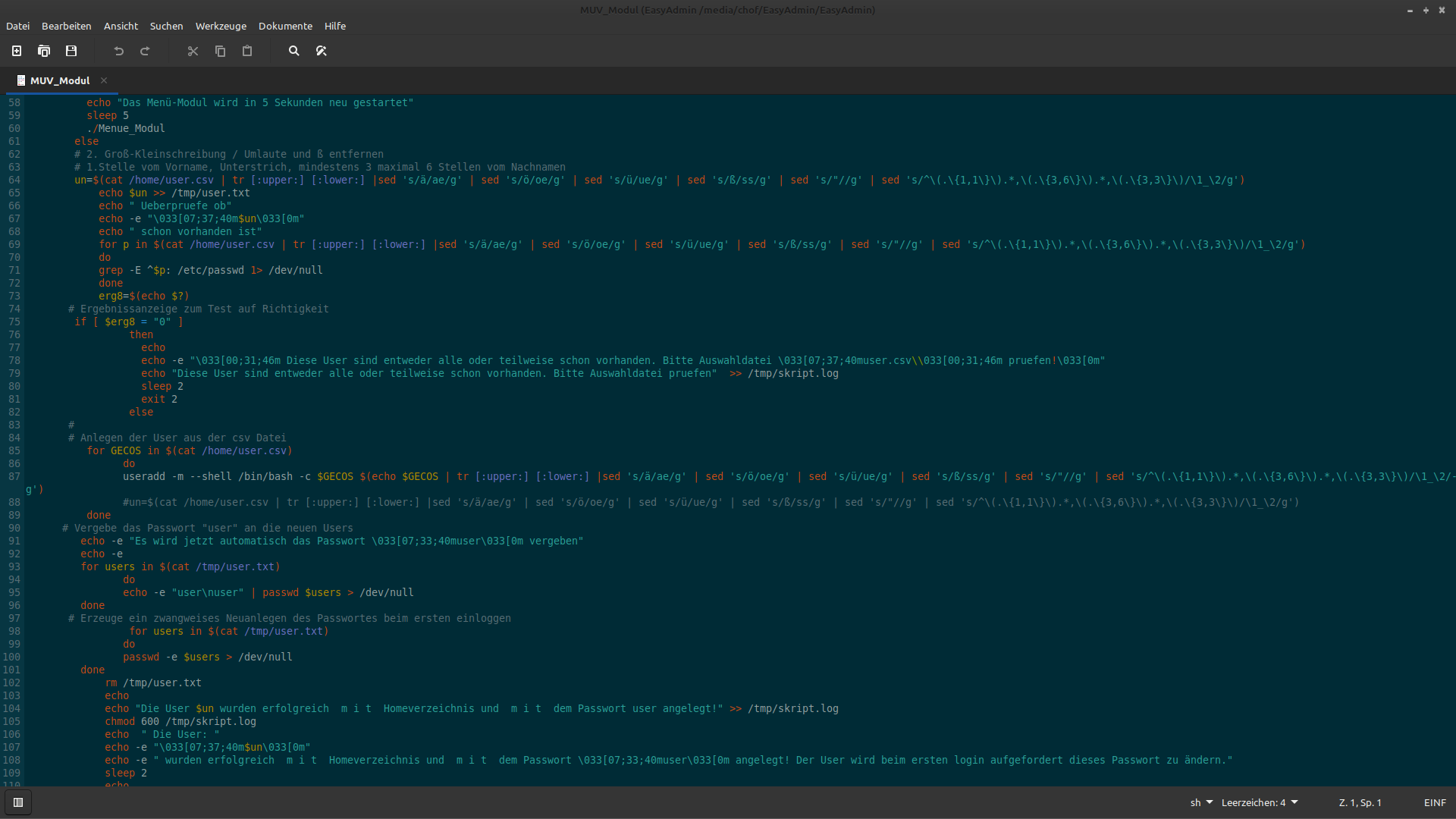 *Mit der Multiuserverwaltung, dem MUV_Modul, können gleichzeitig eine Vielzahl von Usern angelegt bzw. gelöscht werden. Als Grundlage dient eine csv-Datei mit Vornamen und Namen der jeweiligen Nutzer. Durch das Skript werden dann die Umlaute umgewandelt und linuxkomforme Namen gebildet. Jeder User erhält automatisch ein Passwort. Beim ersten einloggen wird der User automatisch und zwingend zur Änderung des Passwortes aufgefordert.